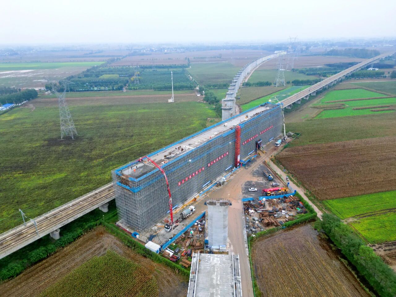 平漯周高铁商周特大桥跨郑阜高铁转体T构连续梁是全线重难点控制性工程之一,该T构连续梁全长161.5米,采用支架现浇法施工,共分7个节段、4个施工段落进行浇筑,完成混凝土浇筑后,将逆时针转体约30度就位。
