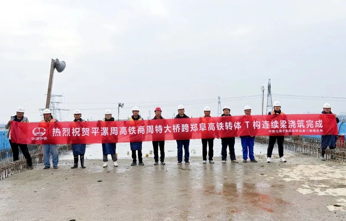 10月21日,经过9个小时的连续浇筑,平漯周高铁全线首个涉铁连续梁——商周特大桥跨郑阜高铁转体T构连续梁顺利完成混凝土浇筑。这标志着由中铁七局承建的平漯周高铁站前八标完成了所有连续梁主体结构混凝土浇筑,为后续架梁施工奠定了坚实基础。