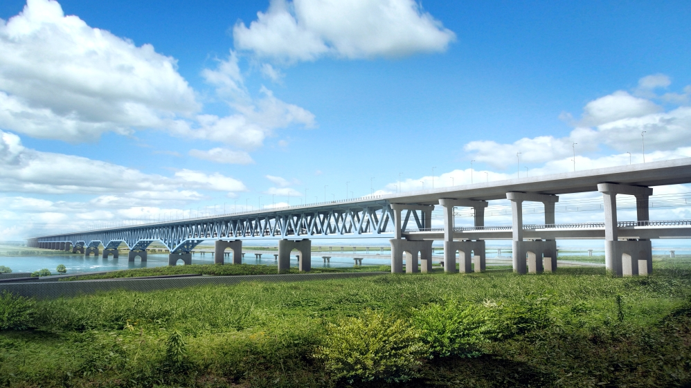 焦洛平高铁洛阳黄河公铁大桥全长13.36公里,主桥长2061米,桥跨布置为(8×108)m连续梁+(128+4×180+128)m连续梁+(2-108)m简支梁,采用双层公铁两用结构。