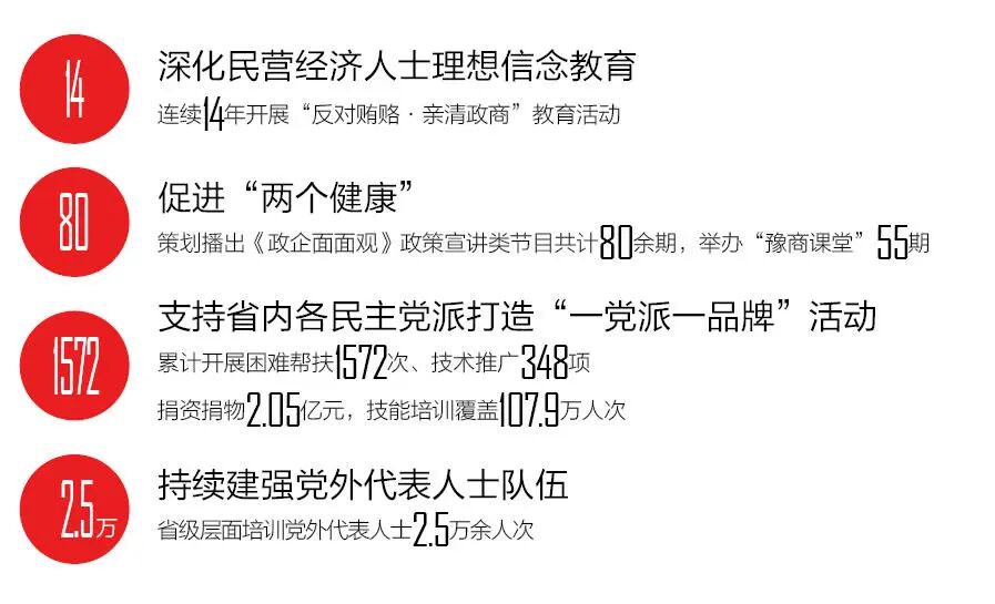 近年来,河南重点开展了“招商引资拼经济·统一战线在行动”活动,举办“同心出彩·港澳台海外代表人士和海内外知名豫商中原行”、豫港经贸交流推介会、全国优强民营企业助推河南高质量发展大会、豫台经贸洽谈会等一系列活动,积极牵线搭桥,为河南招商引资、人才引进等汇聚力量和动能。